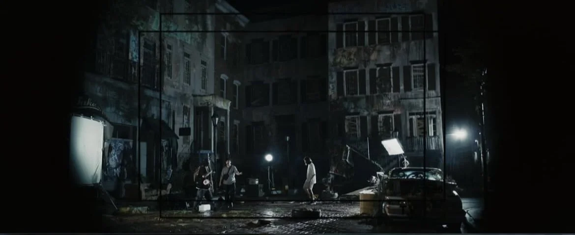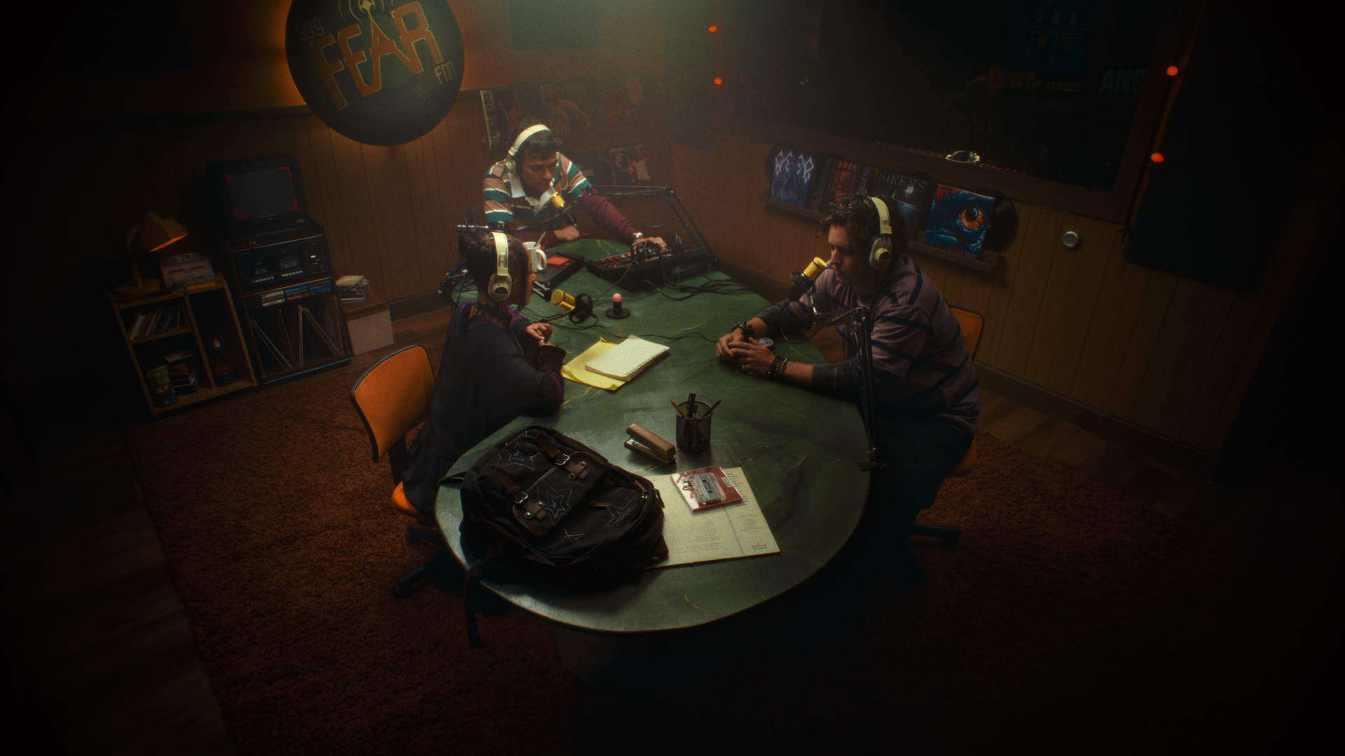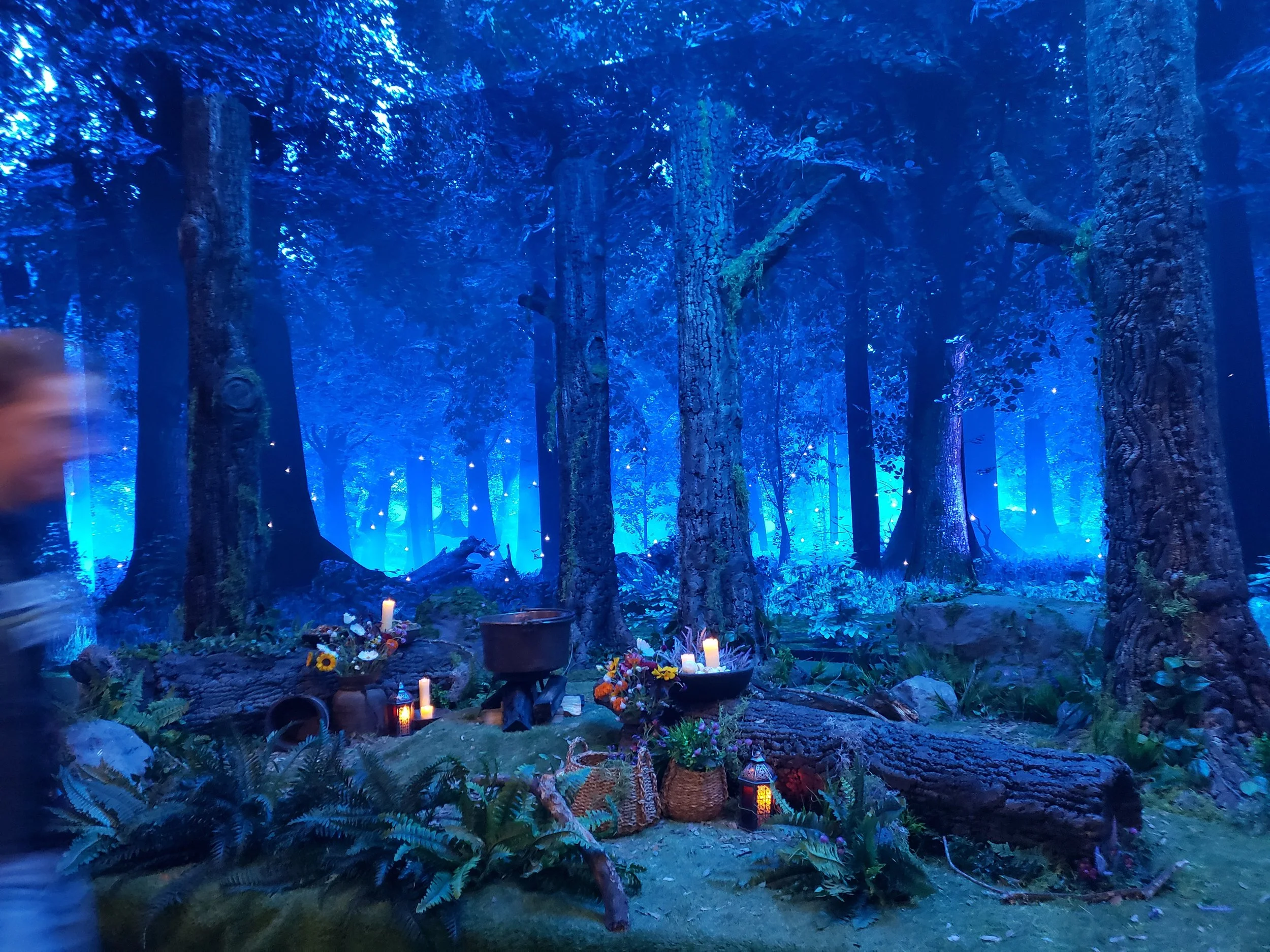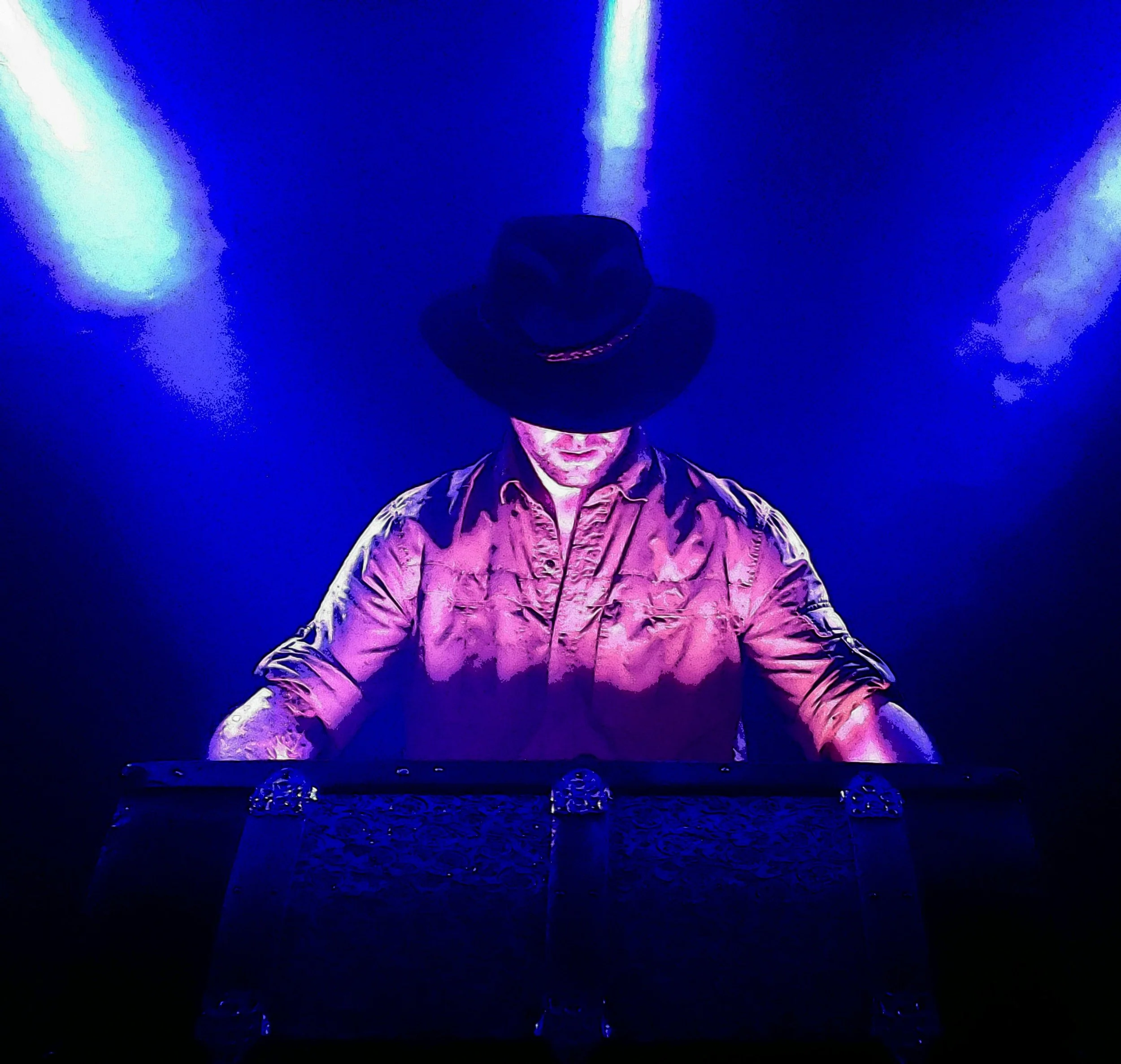 An explorer, cowboy wearing a wide-brimmed black hat and a shiny shirt, illuminated by blue and purple stage lighting, standing behind a treasure chest.